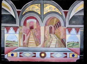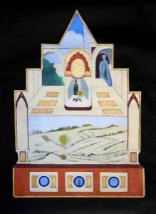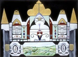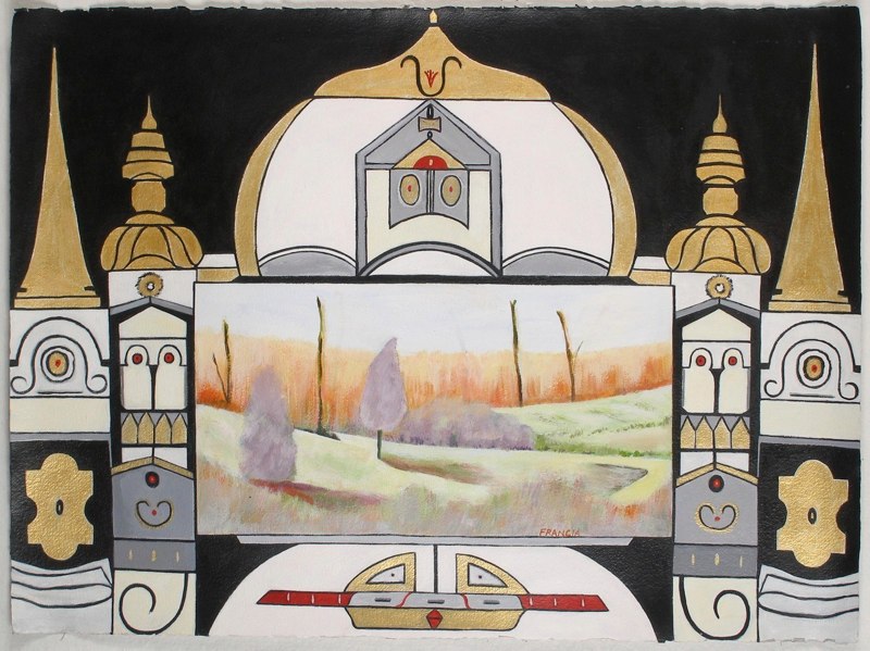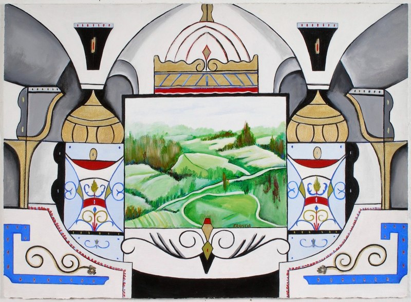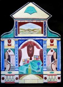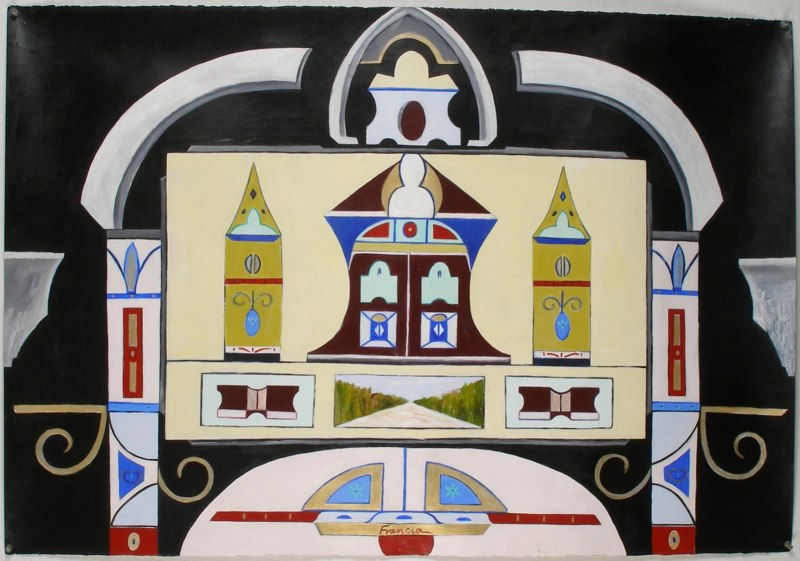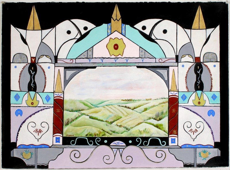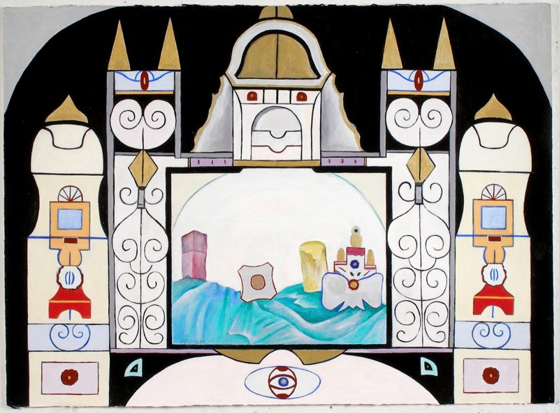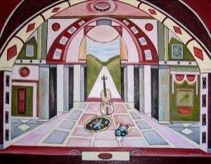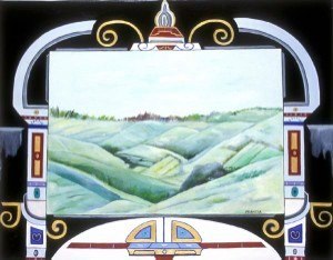 The works are symmetrical and offer designs with a puzzle like quality along with glowing and shaded color contrasts and ornamental design depicting the past. These elements are an integral part of each work and act as a frame around the naturally depicted landscapes and in some cases still lives. The paintings are about life as theatre and they create the backdrop for the Magical Realism series.