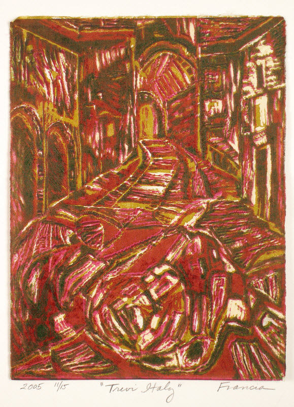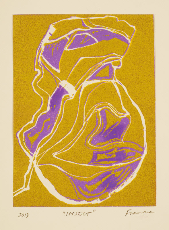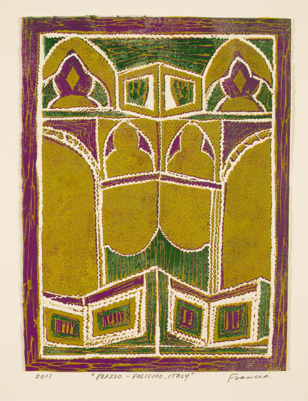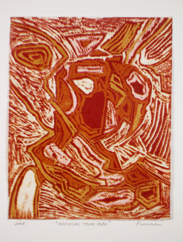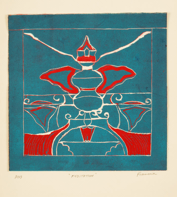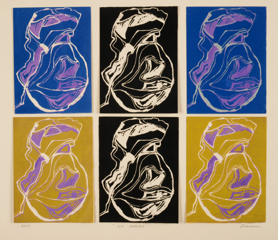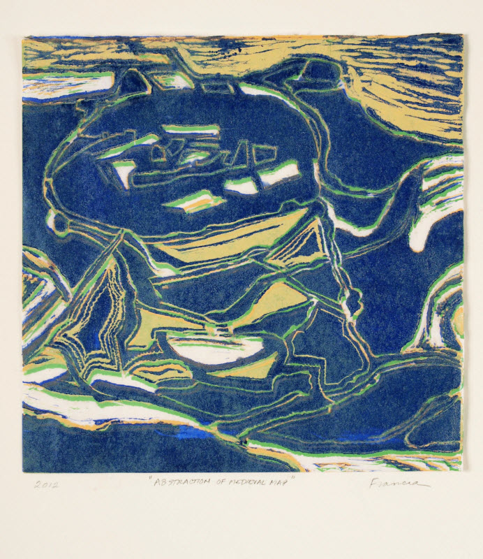 Francia’s linoleum reduction prints are about the layering of colors and the design that is created with each cutting. The positive negative space is created with the color and paper as ground and how they work together. The cutting depends on the tool, and the nuances of textures it creates; the linoleum reduction prints have a strong sense of architecture.