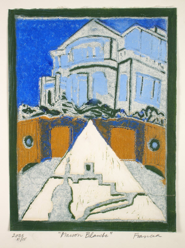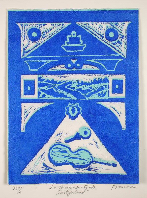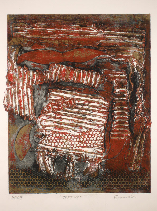 In the Collographs, Francia exhibits her interest in texture and experiments with a variety of materials and color to augment the print.